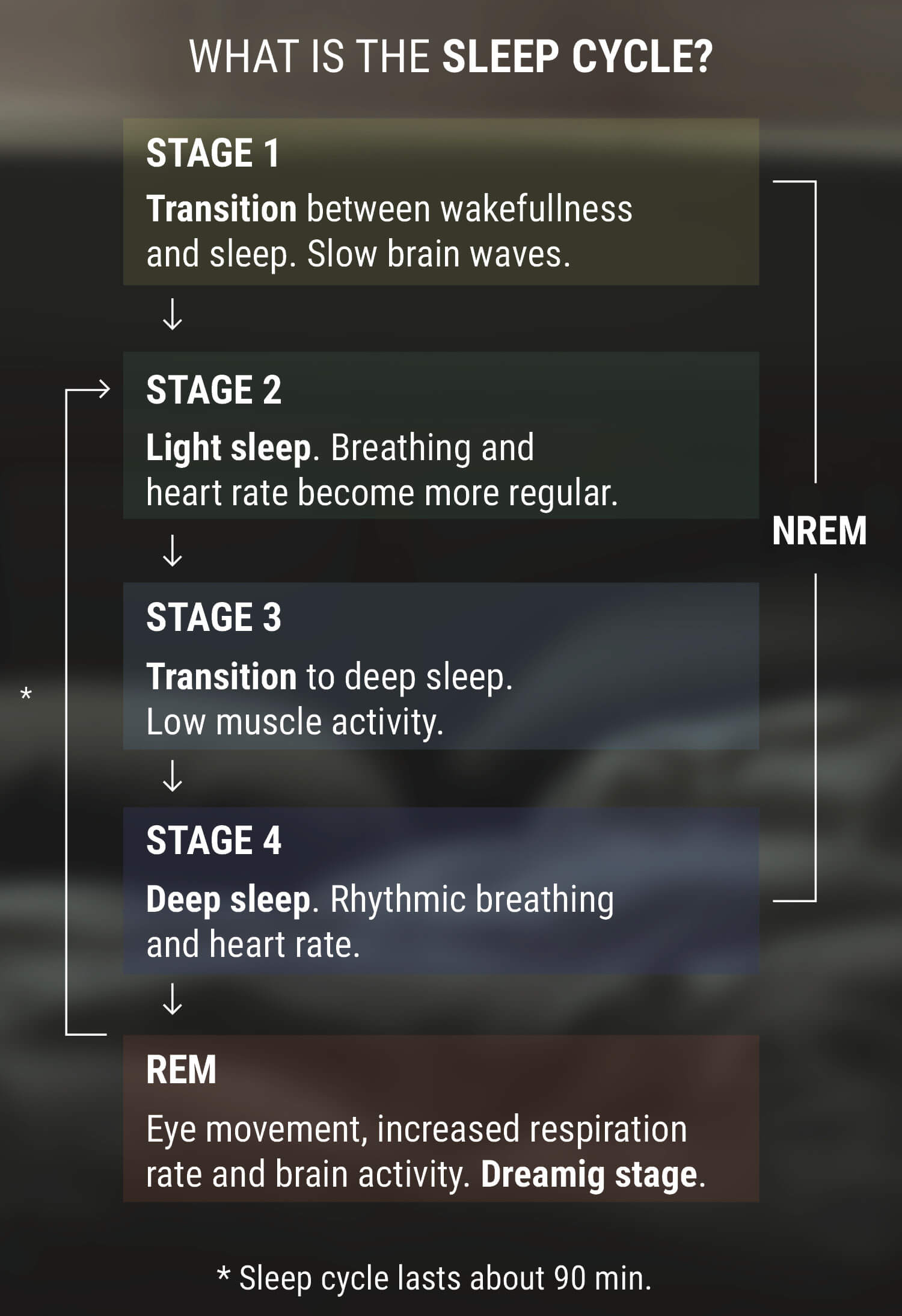 Koko sykli kestää noin 90 minuuttia. Yön aikana kehomme tila vaihtelee NREM- ja REM-tilan välillä. Häiriötön uni on välttämätöntä. 4-6 peräkkäistä jaksoa on optimaalinen yöunen kesto.