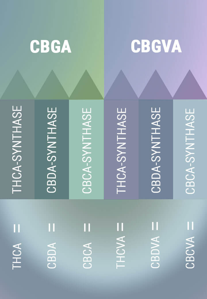 Kun CBGA ja CBGVA yhdistyvät tiettyjen entsyymien kanssa (happopohjainen synteesi), muuttuvat ne biosynteesin kautta happomuodoksi jostain kolmesta pääkannabinoidista, THC, CBD ja CBC. Nyt voidaan nähdä, että uudet kemialliset kaavat ovat hyvin lähellä CBGA:n ja CBGVA:n kaavoja, mutta jokainen uusi kannabinoidi on menettänyt muutaman vetyatomin. Kaikki hiili- ja happiatomit ovat kuitenkin vielä paikalla.