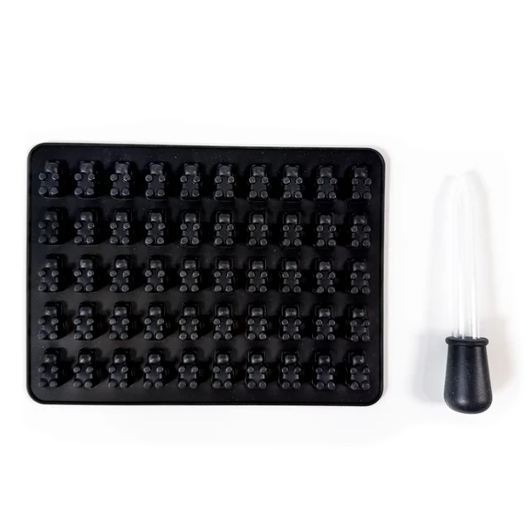 Tee tasalaatuisia syötäviä yhdellä helpolla kaadolla. Tämä musta silikonimuotti on suunniteltu niin, että saat yhdestä erästä 50 tasakokoista nallekarkkia, jolloin koko ja muoto pysyvät samoina ja annostelu helpottuu. Tämä nallekarkki muotti (nallekarkki-muotti) sopii erinomaisesti, kun haluat toistettavan lopputuloksen, myös kannabissyötävien ja kannabiskarkkien valmistukseen. Mukana tulee myös kätevä tiputin/pipetti, jolla täytät kolot siististi, vähemmällä sotkulla ja hävikillä.